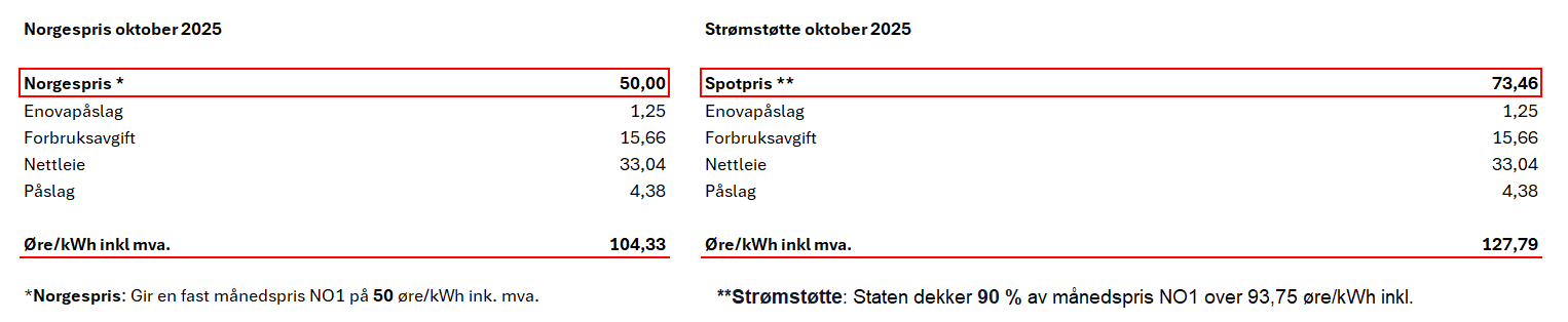 Den 1. oktober kunne alle fjernvarmekunder bestille Norgespris for fjernvarme gjennom ENOVA og NVE sin portal. Ved å velge Norgespris låser du spottprisen på 50 øre/KWh inkl mva. Spotprisen er NO1 delen av energileddet. I tillegg til spottpris NO1, består fjernvarmeprisen av nettleie og avgifter (effektledd, energiledd, forbruksavgift og påslag). Med strømstøtte dekker staten 90% av spotprisen for strøm over 93,75 øre/kWh inkl. mva. Også her kommer kostnader for nettleie og avgifter i tillegg. Se sammenligning av de to ordningene her.