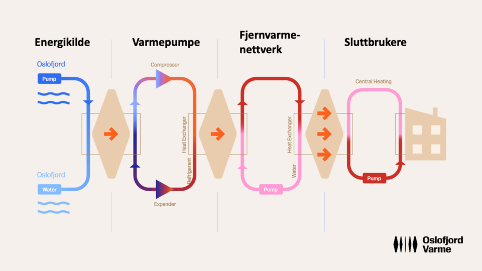 Fjernvarme leveres som varmt vann via nedgravde rør fra våre varmepumpesentraler i Sandvika eller Fornebu/Lysaker.